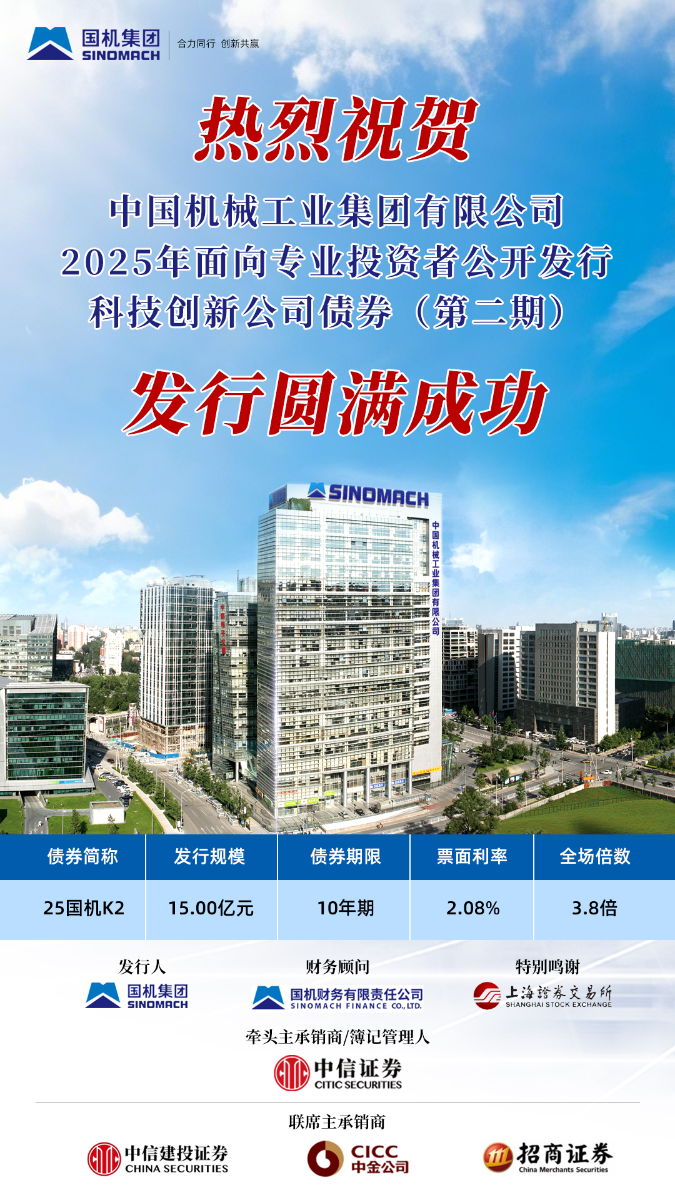6月23日,中国机械工业集团有限公司成功发行2025年第二期科技创新公司债券。国机财务公司作为本次发行财务顾问,紧密跟踪债券市场行情,协助集团完成公司债发行,并积极参与债券申购,有效引导降低融资成本,优化资本结构,助力集团高质量发展。