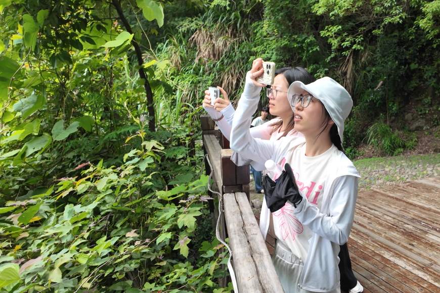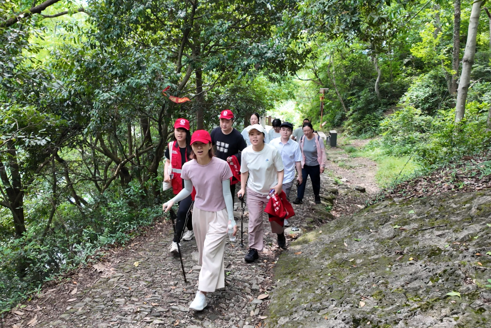 当天下午,公司30名干部职工来到鄞州东钱湖区域亭溪岭古道,从亭溪岭入口出发,沿着山路奋力而上。大家有的一马当先快速登山,有的三五成群携手而行,也有的寻找角度拍摄美景。从第一平台到第四平台,大家穿过林间绿荫、路过蜿蜒山泉、倾听婉转鸟鸣,迎着山间清风登高、摄影。