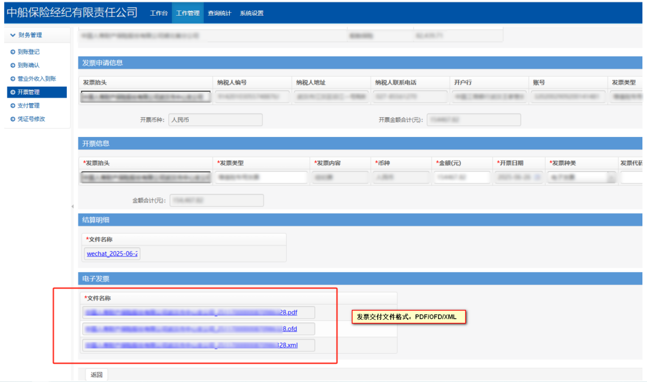 2025年4月,成员单位通过税务云开出首张乐企发票后,财务公司进一步探索“业财税”融合场景,经过扎实调研,于6月份启动并完成了自动化开票接口对接。此次对接改变了中船保险经纪通过“业务系统申请→财务人员登录电子税务局平台手工开票”的工作模式,具备了“业务系统申请自动化开票”功能,实现了“一键取数、一站审批、一体交付”,使中船保险经纪公司财税信息化管理水平进一步提升,也为集团公司实施“业-财-税”穿透式监管积累了经验。