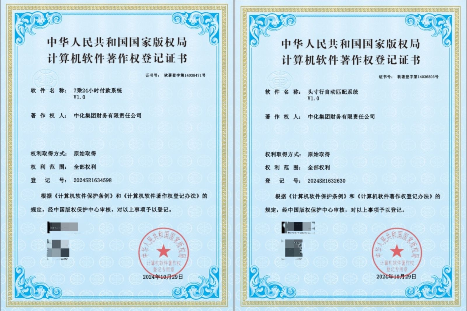 近日,中化财务公司“7乘24小时付款系统”、“头寸行自动匹配系统”获得国家版权局计算机软件著作权