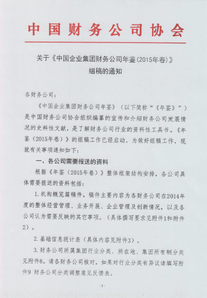 附件:关于《中国企业集团财务公司年鉴(2015年卷)》组稿的通知