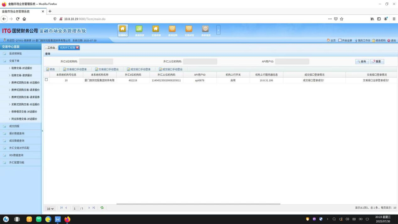 2025年7月30日,厦门国贸控股集团财务有限公司(以下简称公司)金融市场业务管理系统正式接入交易中心,这是继6月14日接入上海清算所的又一系统创新突破,标志着公司金融投资业务的流程优化、交易时效、风险管控又取得了实质性进展。