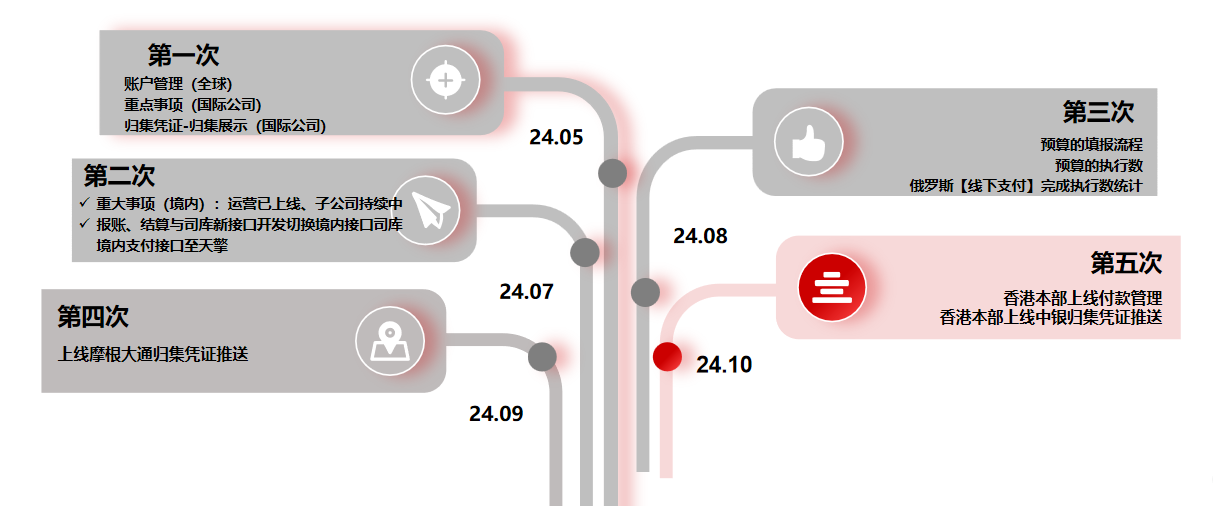 截至目前,境外司库中的账户管理、归集与凭证、重大事项管理实现全球上线,预算管理在红筹公司、香港运