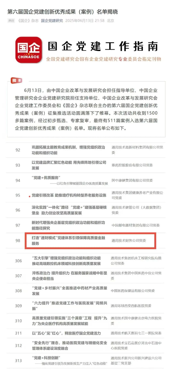 6月13日,第六届国企党建创新优秀成果(案例)评选活动落下帷幕,通用技术财务公司报送的案例《打造“通财模式”党建体系 引领保障高质量金融服务》成功入选。
