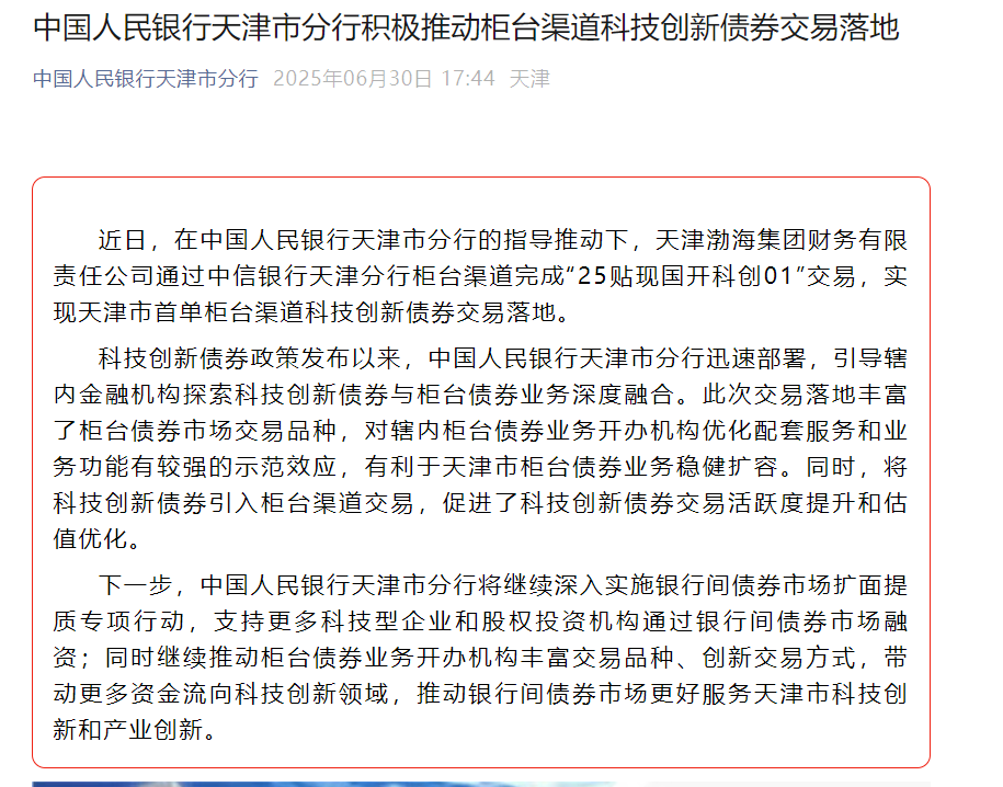 为贯彻落实“加快多层次债券市场建设,构建同科技创新相适应的科技金融体制”决策部署,近日,在中国人民银行天津市分行的指导推动下,渤海财务积极相应、迅速行动,先后完成业务方案设计、系统对接与同业沟通,通过中信银行天津分行柜台渠道完成“25贴现国开科创01”交易,实现天津市首单柜台渠道科技创新债券交易的落地。