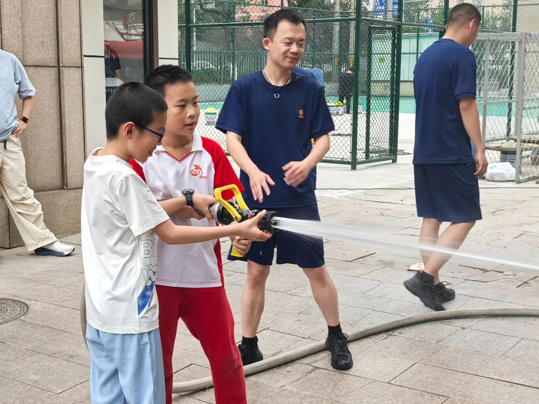 在水枪体验区,消防员为大家演示了水带的快速连接和出水操作,并展示了不同的水枪喷射模式。随后,小朋友和家长们纷纷踊跃参与,亲自握住水枪体验。在水流的冲击下,孩子们感受到了灭火过程的紧张与刺激,也更加明白了消防安全的重要性。
