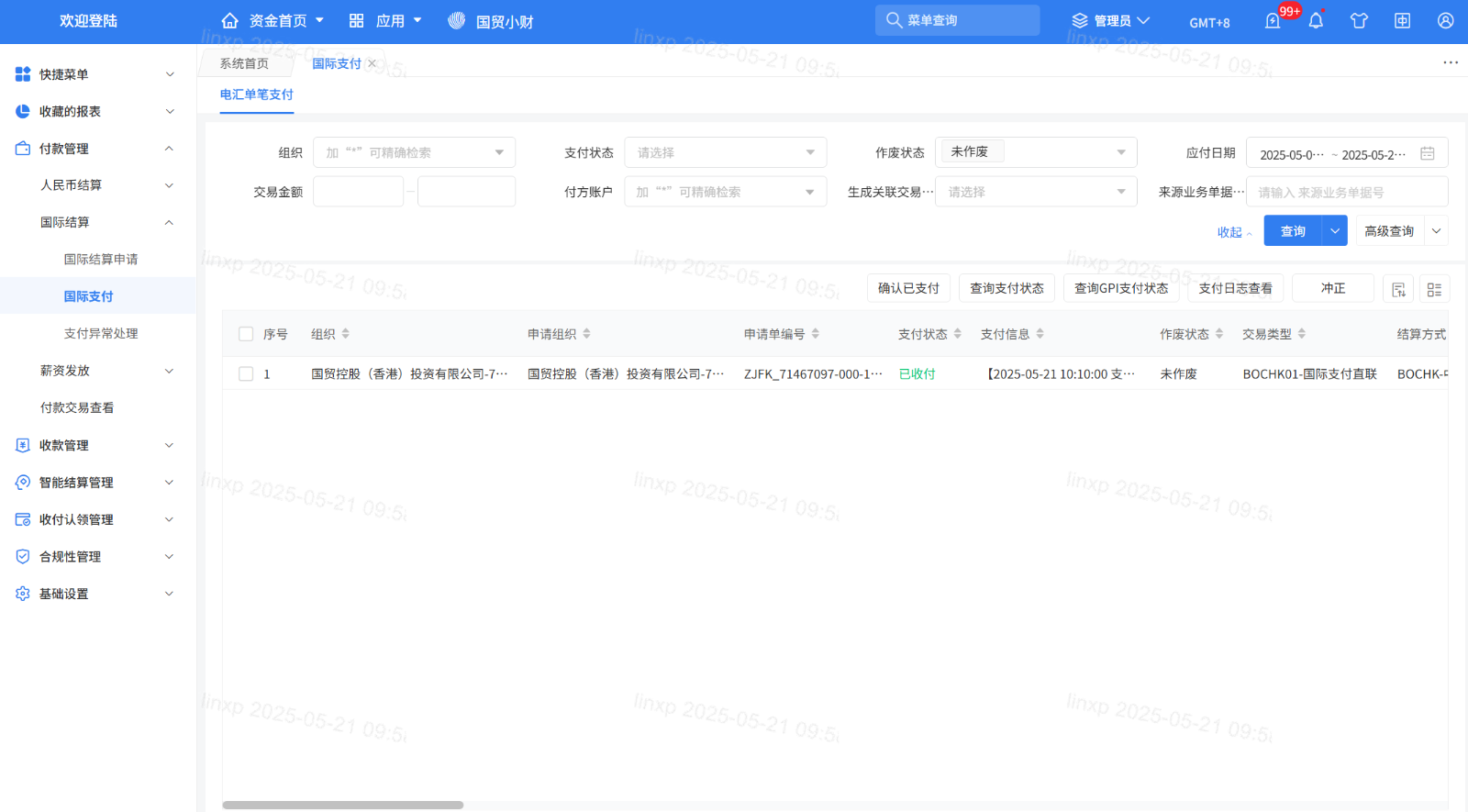 2025年5月21日,国贸控股集团全球司库运营管控中心的境外银行付款功能正式通过中国银行(香港)成功落地,首笔跨境资金支付业务顺利完成。此举标志着国贸控股在司库管理领域的数字化转型迈出关键一步,为集团全球化资金统筹管理、提升跨境业务效率提供了重要支撑。