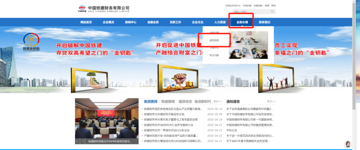 点击官网首页上方“业务办理”菜单栏下的“业务咨询”,自动跳转智能客服系统。