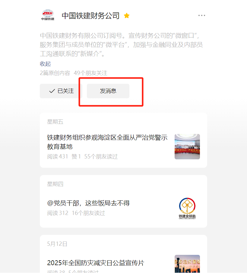 1.进入铁建财务官方微信公众号,点击“发消息”进入聊天框;