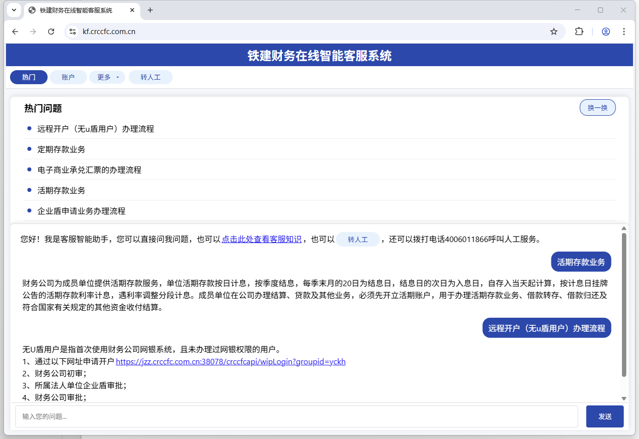 此次智能客服系统2.0版的核心升级亮点显著。在技术融合上,系统创新性地整合Deepseek最新一代AI技术,经300+专业金融知识库的精准训练,能够以较高的准确率来智能识别用户意图,并以拟人化的对话方式为客户提供专业解答。在服务模式上,构建起三重智能服务体系,知识库智答可在0.5秒内精准匹配标准问题;面对复杂金融咨询,AI深度对话功能进行多维度分析;遇到特殊需求时,智能转人工服务实现无缝衔接。同时,系统充分考虑客户使用场景多样化的需求,能够进行PC端和移动端的自动适配,并支持IE11等老旧浏览器,实现全平台兼容,响应速度大幅提升,保障7×24小时稳定服务。
